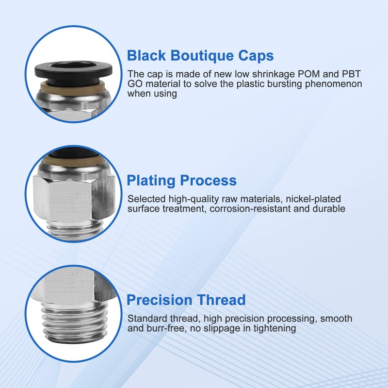 1. Estos accesorios de empuje para conectar están hechos de plástico y cobre de alta calidad, alta resistencia a la presión, fuerte dureza, buen sellado, sin fugas de aire, uso más cómodo.
