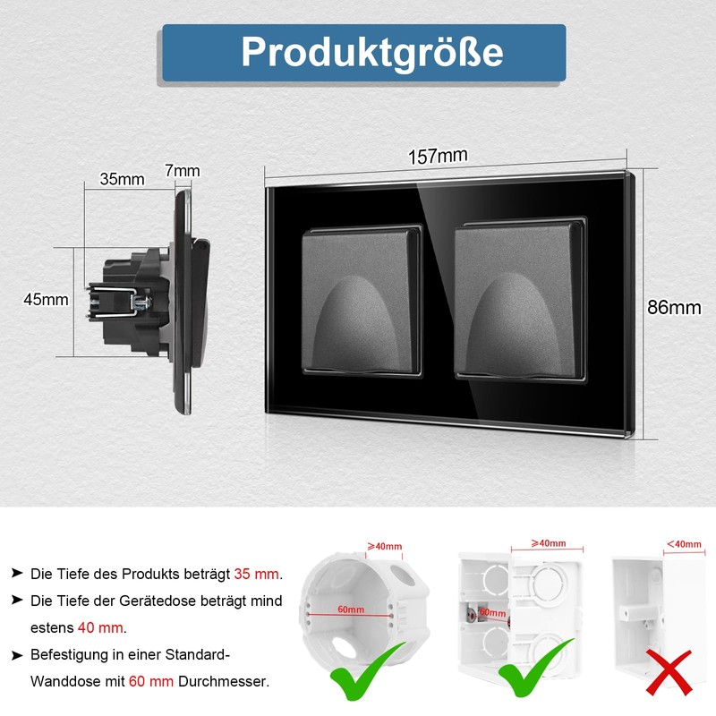 - Socket with claws: 157 mm x 86 mm single socket, the depth of the flush-mounted wall socket is 35 mm, installation in a flush-mounted box (depth 40 mm or more) with clamping claws or screws.