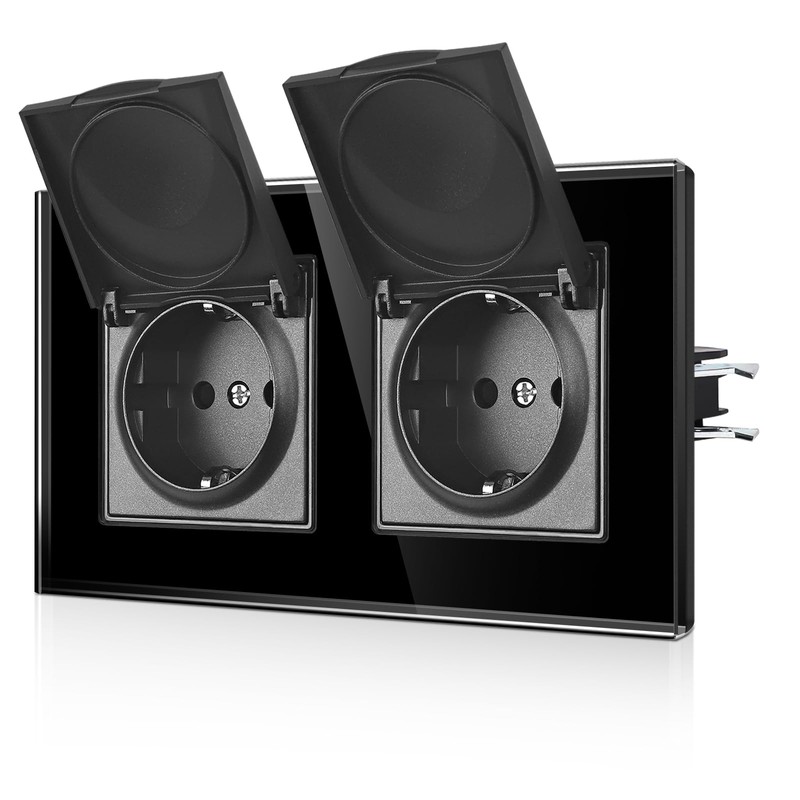 CNBINGO Waterproof Double Socket with Lid - Schuko Socket with Claws - Double Wall Socket with Glass Panel - EU Standard Socket Flush-Mounted with Hinged Lid - 2 Compartments Black