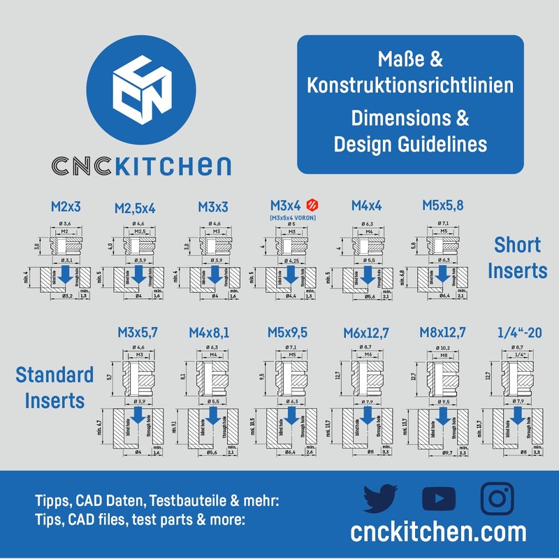 - Original CNC kitchen thread inserts, (short version for little space), for insertion into 3D printed plastic components (PLA, PETG, ABS, etc.)