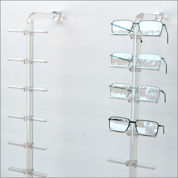 The DWYFL acrylic wall mount eyewear display is available in three lengths offering 10 flat frame holders per rod. The eyewear holders are removable and adjustable.