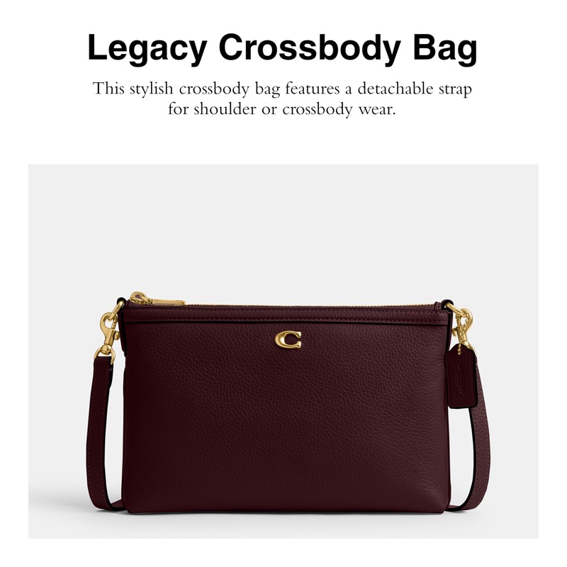 - Editor's Notes: An iconic Coach silhouette, our Legacy Zip-Top Crossbody is an easy, everyday bag. Featuring a spacious interior and an outside zip pocket to secure essentials, it’s crafted of refined pebble leather detailed with our Signature hardware.
