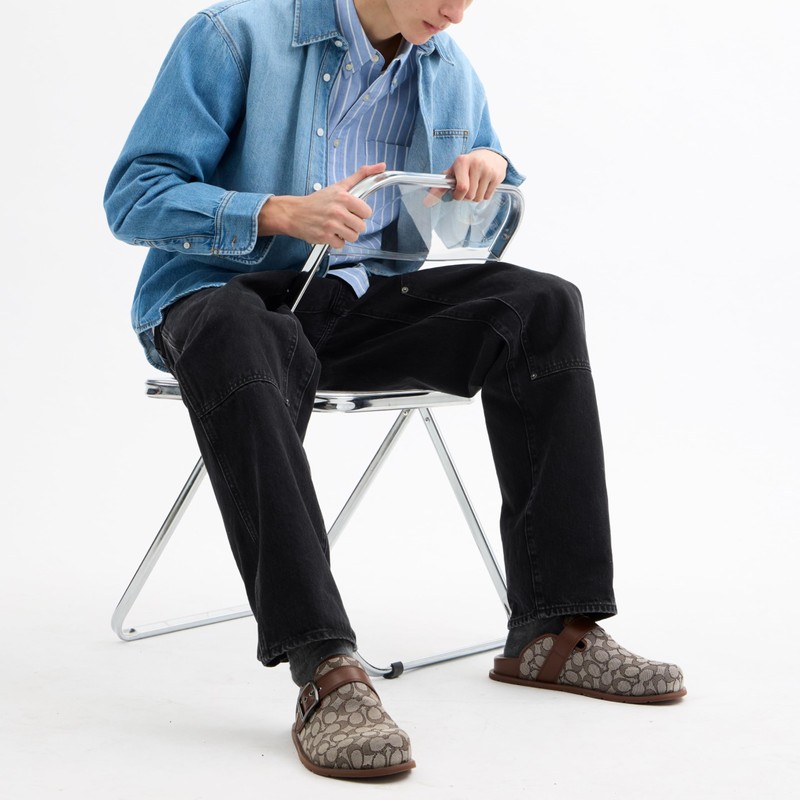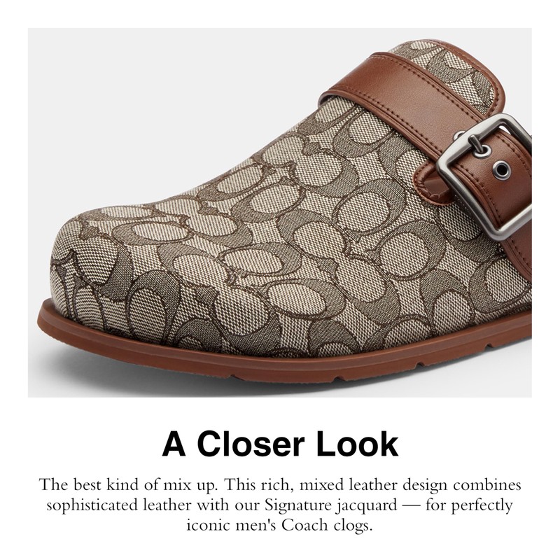 - Signature Jacquard & Leather: The best kind of mix up. This rich, mixed leather design combines sophisticated leather with our Signature jacquard - for perfectly iconic men's Coach clogs