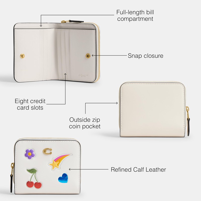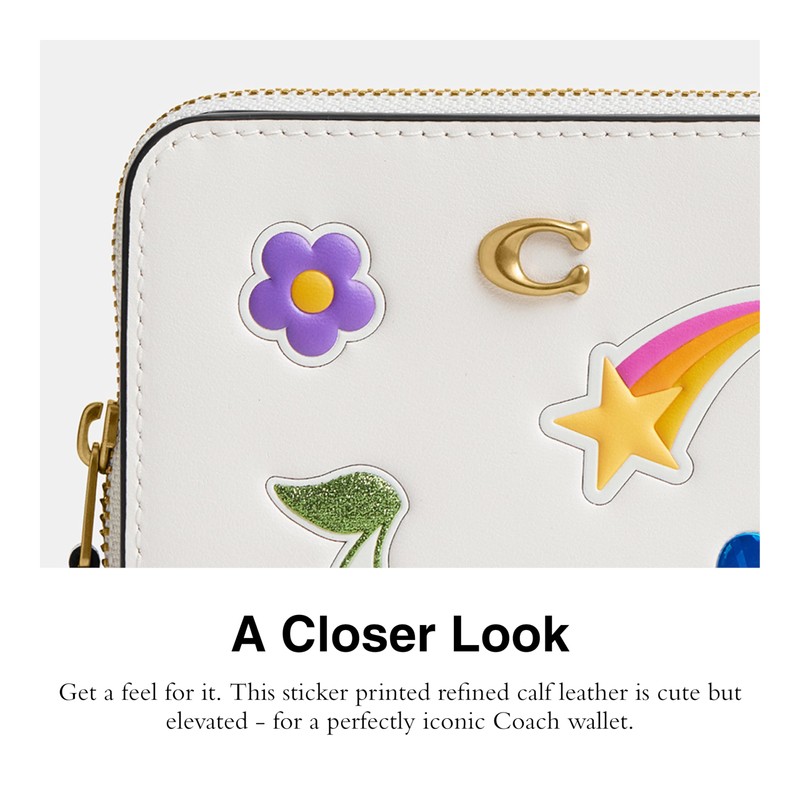 - Refined Calf Leather: Get a feel for it. This sticker printed refined calf leather is cute but elevated - for a perfectly iconic Coach wallet