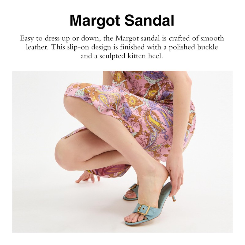 - Editor's Notes: Easy to dress up or down, the Margot sandal is crafted of smooth leather. This slip-on design is finished with a polished buckle and a sculpted kitten heel.
