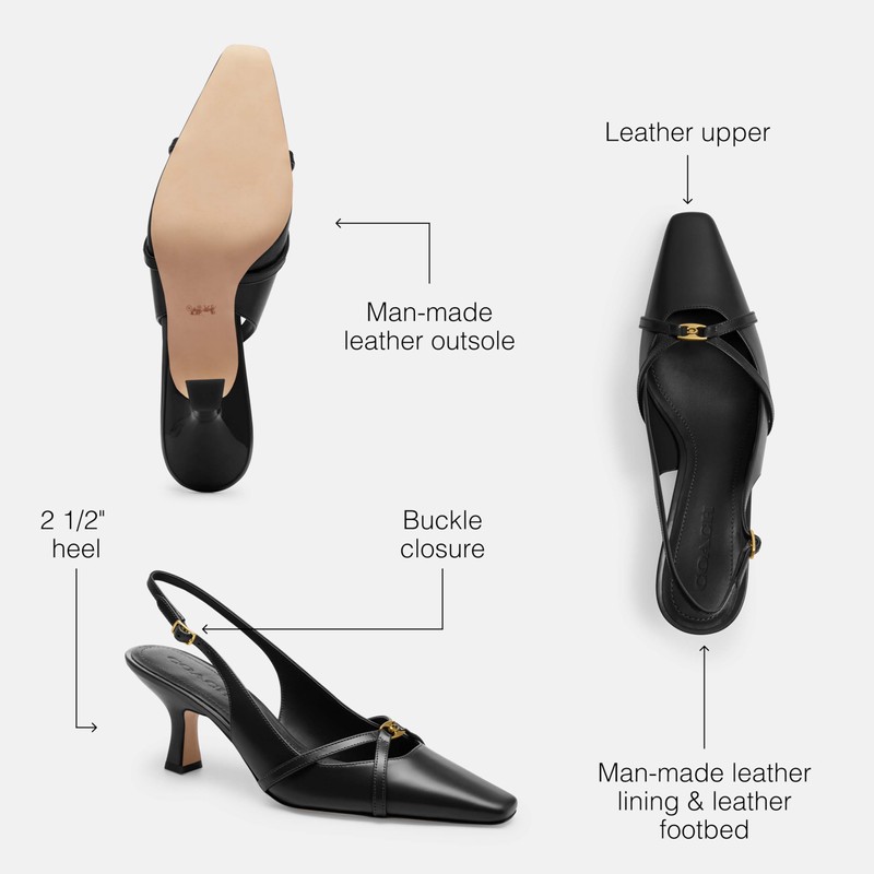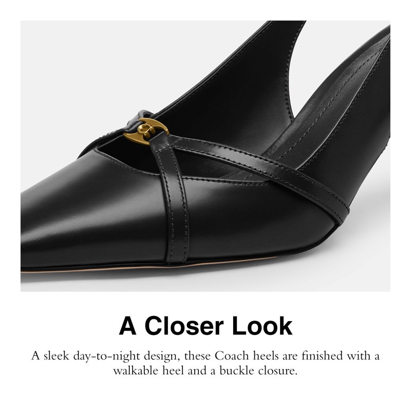 - Smooth Leather: A sleek day-to-night design, these Coach heels are finished with a walkable heel and a buckle closure