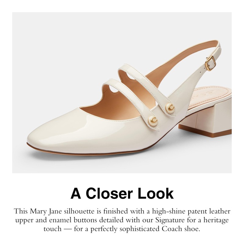 - Patent Leather: A sleek day-to-night design, this Mary Jane silhouette is finished with a high-shine patent leather upper and enamel buttons detailed with our Signature for a heritage touch - for a perfectly sophisticated Coach shoe