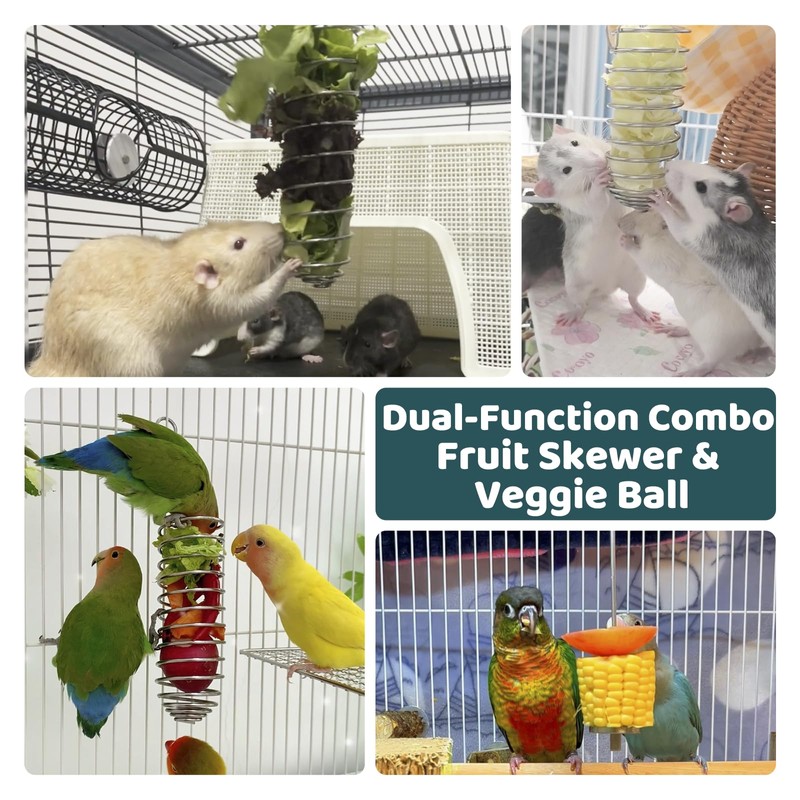 - Dual Foraging Toy Set - More Fun, More Nutrition: Includes a spiral veggie ball and a straight fruit skewer, ideal for holding leafy greens and firm fruits separately - offering sensory variety and foraging enrichment. Measurements: Spiral ball: 8.6" L × 1.8" Dia, Skewer: 9" L