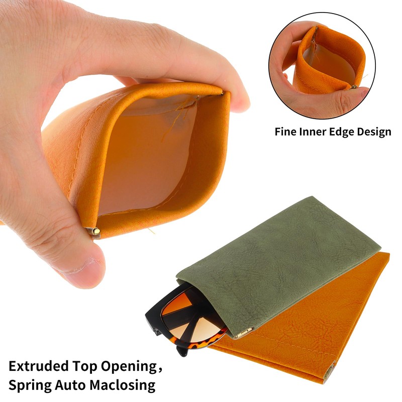 - Squeeze Top Sunglasses Pouch Holder: the opening is designed with a metallic spring plate clasp and the inside is made of soft leather material, which is soft, durable and not easy to damage. Lightweight, portable, does not take up too much space in the wallet and protects the lens and frame from scratches.