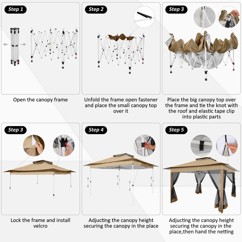 - Easy Up Frame & Upgraded DesignsOur outdoor gazebo canopy tent 10x10 is designed with pop up frame, which can be installed in minutes by one or two people. Thicken metal tubes and upgraded interior hooks make our screen canopy tent more wind-resistant and show more sturdy performances. With an additional carrying bag, you can easily bring our portable gazebo anywhere.