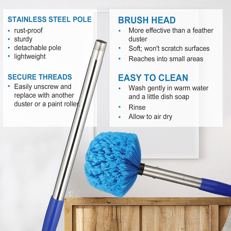 - ADJUSTABLE LENGTH DUSTER: This cleaning duster consists of multiple stainless steel duster rods that can be added or subtracted as needed to achieve the right length. You no longer need a ladder or footstool to clean hard-to-reach areas such as ceilings, fans, corners, etc., ensuring that every corner is spotless.