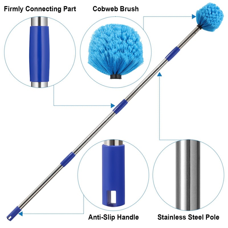 - STRONG AND DURABLE: The bristles of this cobweb brush are made of high-quality PET material, and the cleaning brush is washable and moderately hard to effectively clean cobwebs and dust, including the extremely sticky cobwebs encountered outdoors.