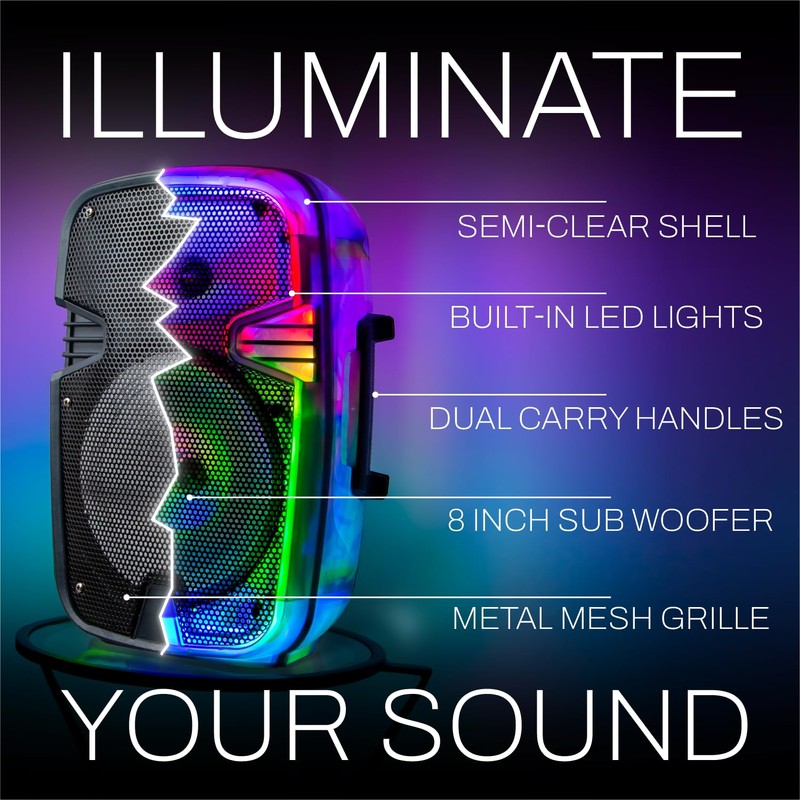 Coby Bluetooth Speaker w/LED Lights, Semi-Translucent Body, Bluetooth 5.3, 11 Hour Playtime, Carrying Handle, LED Light Show | Multiple Pairing