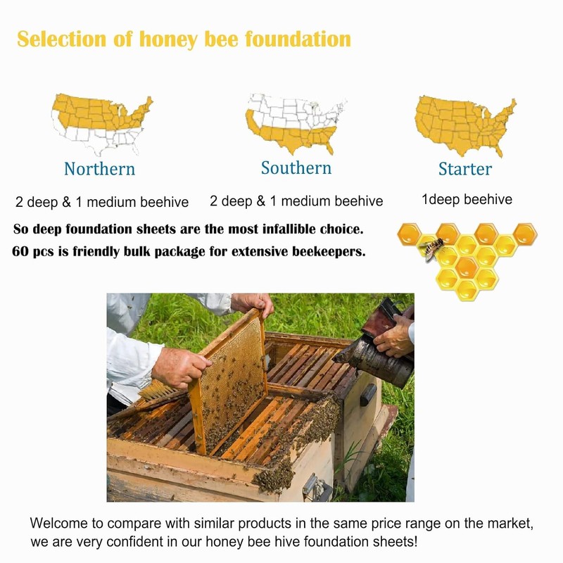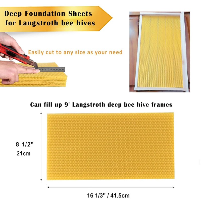 - 🐝 MUST HAVE DEEP FOUNDATION WAX SHEETS: Package included 60pcs bee hive wax deep foundation sheets. Custom size 100% fit standard deep Langstroth bee hive, nice for large scale beekeepers with wholes price.