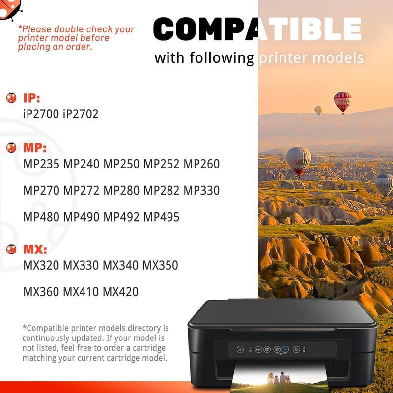 • Compatible with printers: PIXMA series: iP2700, iP2702, MP230, MP235, MP240, MP250, MP252, MP260, MP270, MP272, MP280, MP282, MP330, MP480, MP490, MP490. 2 MP49 5 MP499 MX320 MX330 MX340 MX350 MX360 MX410 MX420
