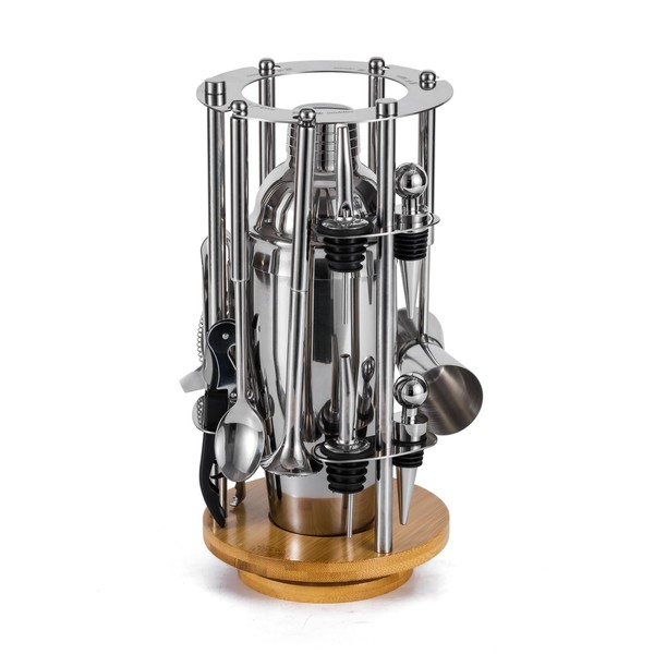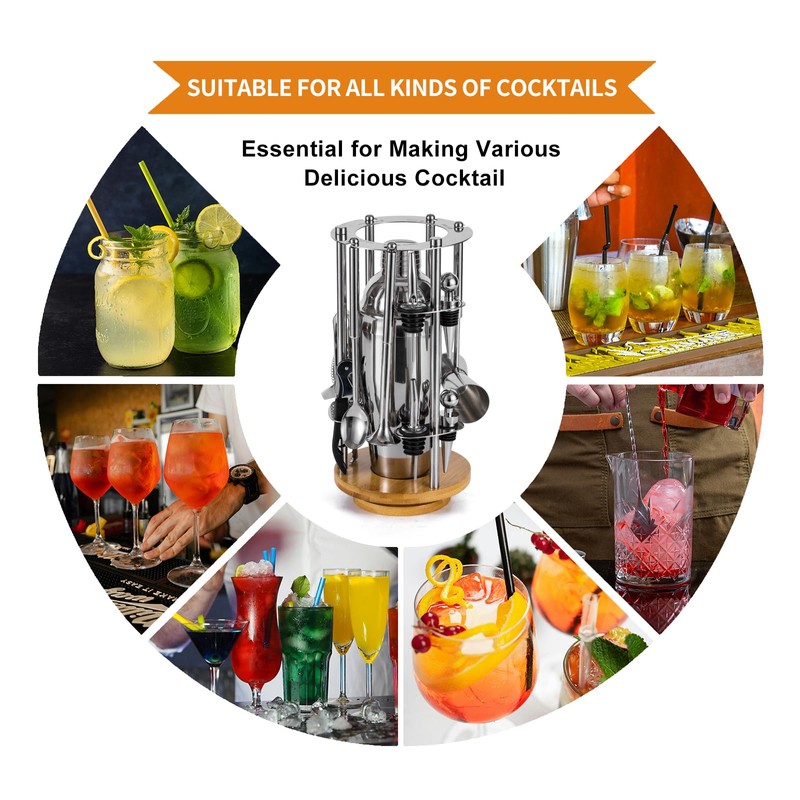 - [Professional bartender set] : food-grade stainless steel equipment comes with storage bracket, 360° rotating storage bracket goodbye clutter,13 tools perfectly placed, food-grade 304 stainless steel safe contact ingredients, durable, but also includes a food guide.