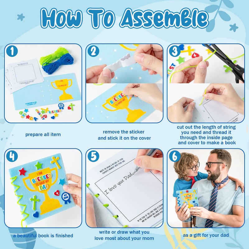 - Easy to Use: First, prepare all item. Second, remove the sticker and stick it on the cover. Third, cut out the length of string you need and thread it through the inside page and cover to make a book. Then, write or draw what you love most about your dad. Finally, as a gift for your father.