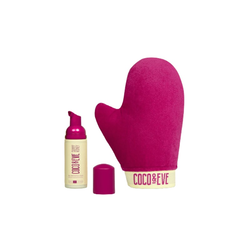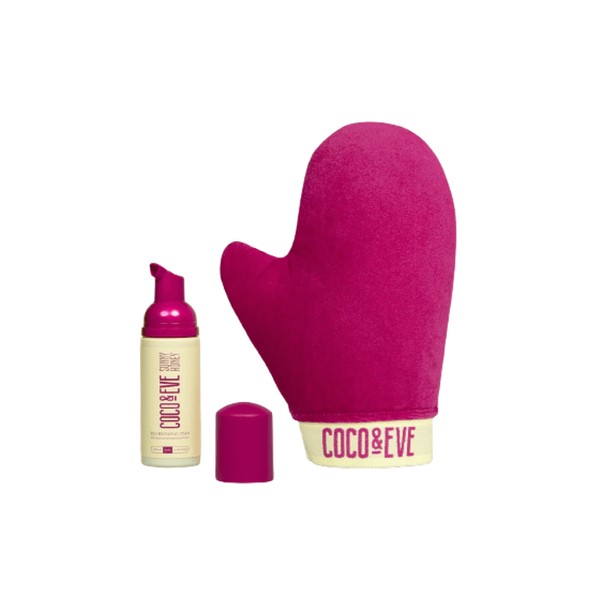 The Coco & Eve Self Tan Travel Kit - Dark includes a 50ml bottle of bestselling Bali Bronzing Foam and a hypoallergenic soft velvet self tan mitt, perfect for all your trips.