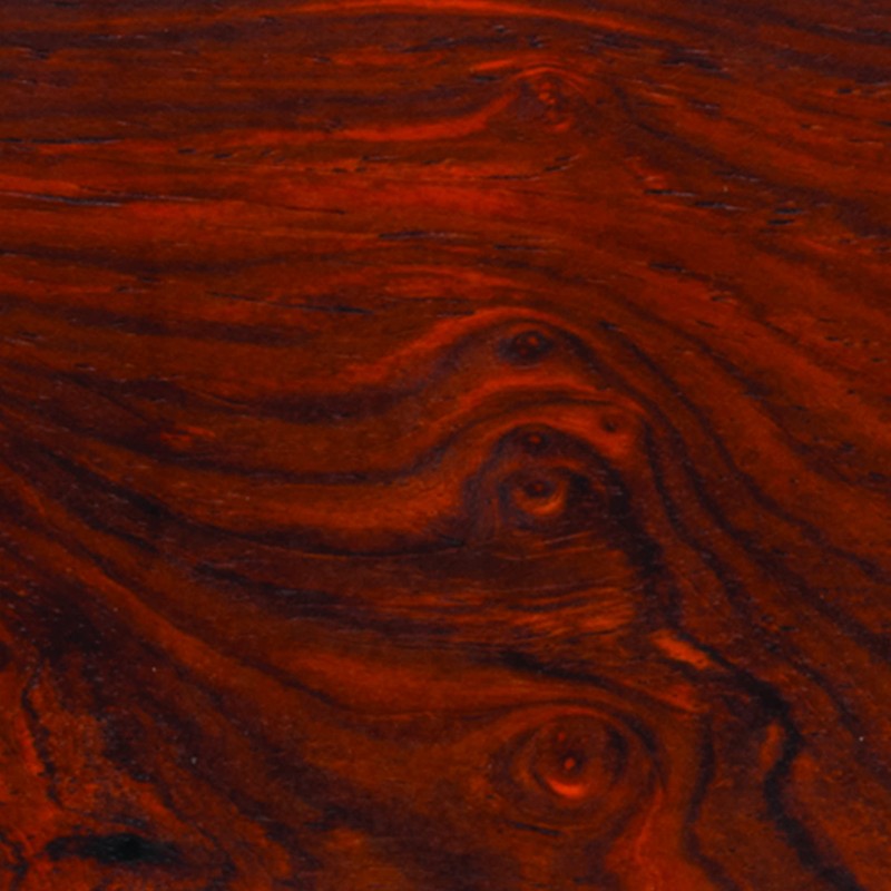 Cocobolo (Dalbergia sp) can be seen in a kaleidoscope of different colors, ranging from yellow, orange, red, and shades of brown with streaks of black or purple. The color turns deep orange red with exposure. It is a hard and heavy wood with irregular grain with a medium fine texture. Like most rosewoods, it has natural oils that give it excellent resistance to decay. Cocobolo is used for fine furniture, musical instruments, turnings, and other small specialty objects, excellent turning properties. Larger blocks are sawn to +/- 1/4" of size listed, smaller blocks +/- 1/8". Spindle stock (1-1/2" - 2") dimensions are +/- 1/8". Grain runs with the longest dimension. Central America.