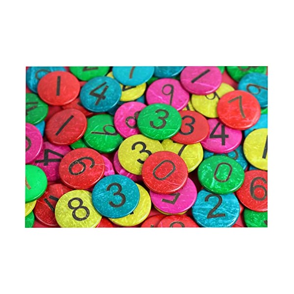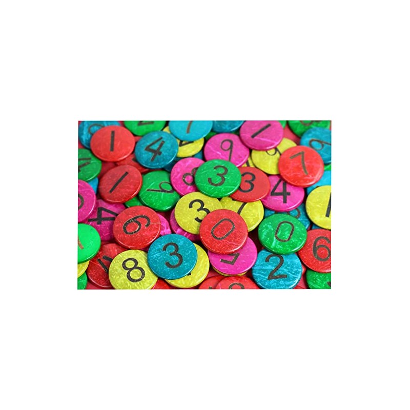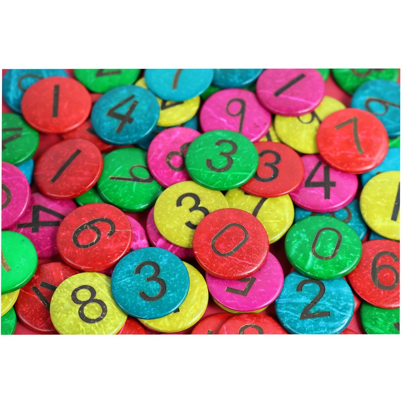 - COCONUT SHELL NUMBERS | Pack of 50 coloured (red, yellow, green, blue, cerise) coconut shell discs each with a number from 0 to 9. Each counter has a diameter of 2.5cm
