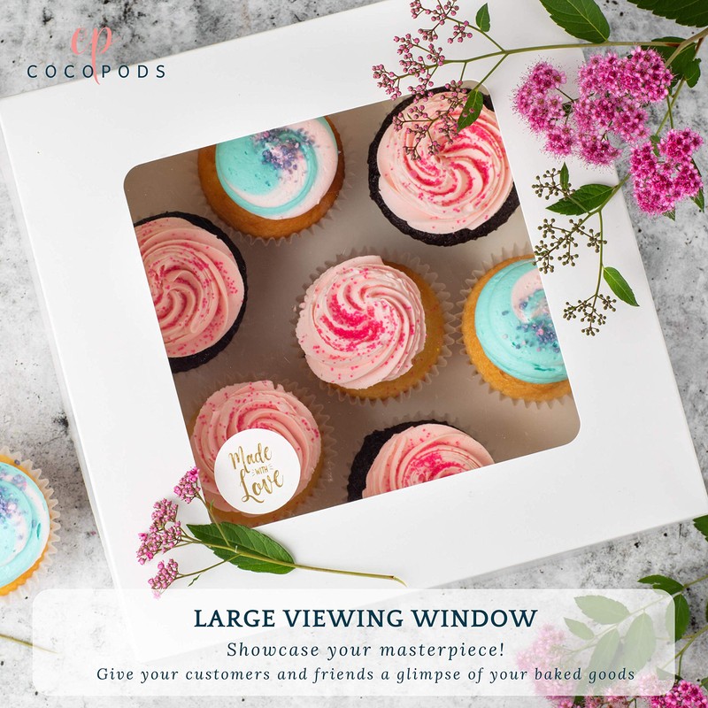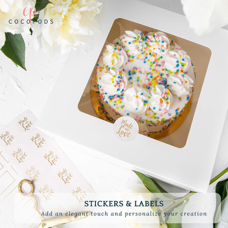 Tired of flimsy cake boxes that easily tear when handling desserts?Presentation is very important when it comes to desserts. This includes your box. You cannot impress customers if you hand them a cake box that easily bends and looks like it will tear any moment.If durability is an important factor for you, it's time to get rid of your old containers and replace them with reliable ones. The last thing you want is for your dessert to accidentally fall on the floor just because your box is too cheap and of poor quality.The COCOPODS Cake Box with Viewing Window is made of premium-quality material that will not easily tear!Protect your desserts from damage with our sturdy cake box. It holds pastries, pies, cupcakes, donuts, cookies, and even heavy cakes without losing shape. It's a reliable container for delivery, takeaways, and bake sales.What's special about our cake boxes is it's elegant appearance, making it a great choice for dessert presentation. With a transparent window on top, you can easily showcase your sweet and sugary desserts, enticing customers or recipients right on the spot.Our cake box comes with stickers that will make your recipients extra special. If you are gifting a friend, colleague, or family with your dessert, you can use the included blank stickers to write your personal message or greeting. You can also use our printed Made with Love sticker for thanking customers.Still not convinced? Here are additional reasons to help you make the right choice: Front-loading design Folds flat for easy storage Makes a great gift for bakers and pastry shop ownersPresent your baked masterpiece with classy and elegant packaging. Add COCOPODS Cake Box with Viewing Window to your cart TODAY!
