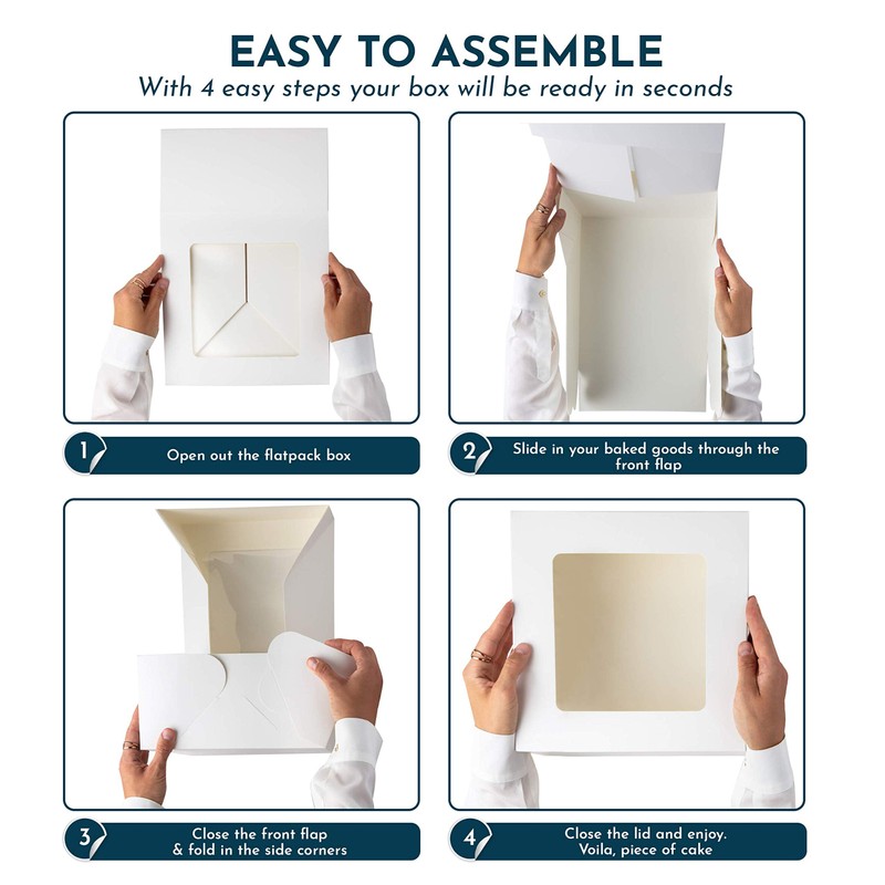COCOPODS COCOPODS 25 Pack Auto Pop-Up Cake Boxes with Viewing Window & 50 Stickers - This White 10x10x5 Bakery Boxes Container is Suitable For Cakes, Cupcakes, And Cookies - Dessert Boxes with Clear Display