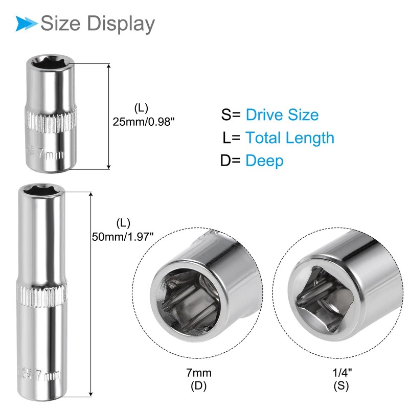 - ★ 6-Point Socket Size --- Drive: 1/4"; Deep: 7mm; Total Length: 25mm / 0.98",50mm / 1.97"; Package includes: 2 x Impact Socket.