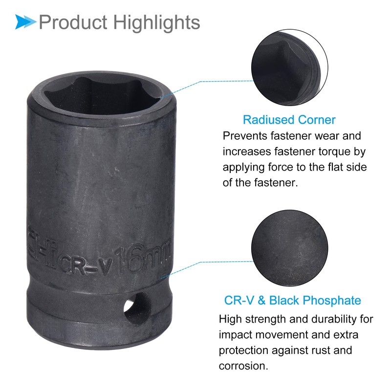 CoCud Deep Impact Socket, 1/2 Inch Drive 6-Point 16mm, CR-V Metric Deep Sockets
