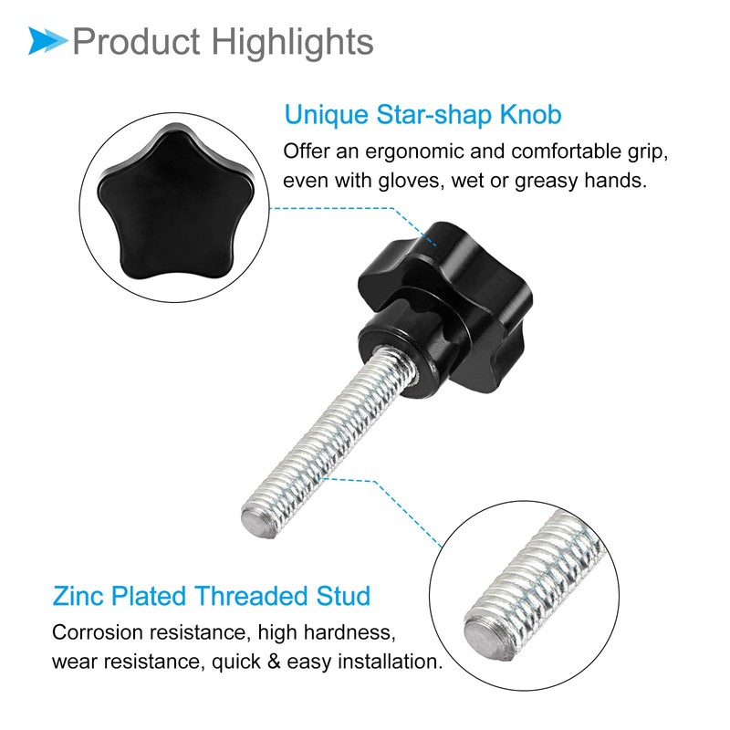 --- The unique star-shap plastic knobs offer an ergonomic and comfortable grip, even with gloves, wet or greasy hands. The clamping knob has a threaded stud that attaches to a mating component for quick and easy installation. The zinc plated metal bolt provides good oxidation and corrosion resistance, higher hardness, more wear resistance, and smooth surface. Made from thermoset plastic for long-lasting performance and wear resistance. The tightly-in plated steel metal insert hand screws allow adjustment without additional tools. The thumb screws provide an easy-to-use and reliable way to make optimal control for adjusting and tightening components.