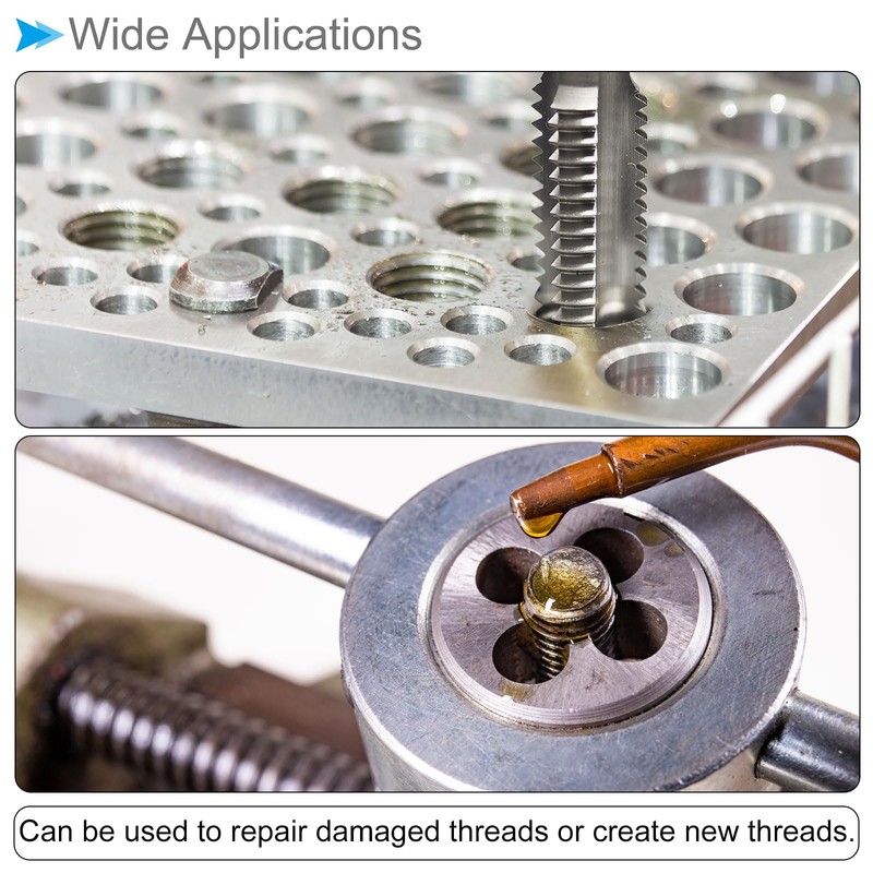 - ★ Wide Applications --- Repair damaged threads or create new threads in stainless steel, aluminum alloy, cast iron, copper, iron, aluminum, and plastic. The thread tap is used for tapping internal threads in through holes or shallow blind holes, such as threads in nuts, threaded inserts, pipes, valves, and the round die can process, correct or clean external threads on rods or bars, bolts or studs.