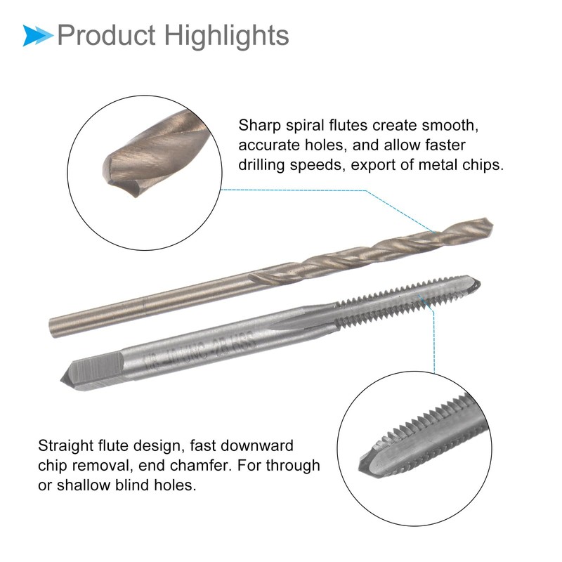 - ★ Ease of Use --- The machine tap is designed with straight flutes and fast downward chip removal, suitable for tapping machines, drilling machines, CNC and milling machines. The drill bit with sharp spiral flutes can create smooth and accurate holes, and allow faster drilling speeds, export of metal chips, and improved coolant flow.