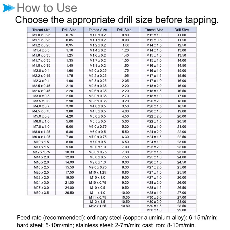 --- High speed steel tools have high hardness, high strength, good toughness, wear resistance and heat resistance. Substrate only, no additional coatings are available for a wide range of applications. Tap depth should not exceed 1.5 times of diameter (e.g., diameter = 6 mm (M 6), maximum tap depth = 9 mm). Drill holes with hemp before taping. Tap angle must be 90 degree vertical and stable Adding appropriate tap oil to get better quality female threads and heavy duty taps.
