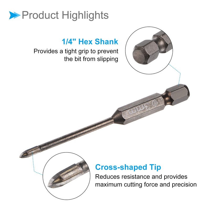 - ★ Professional Masonry Drill Bits Size --- Cutting Dia.: 3mm / 0.12", Shank Type: 1/4" Hex Shank, Overall Length: 74mm / 2.91".