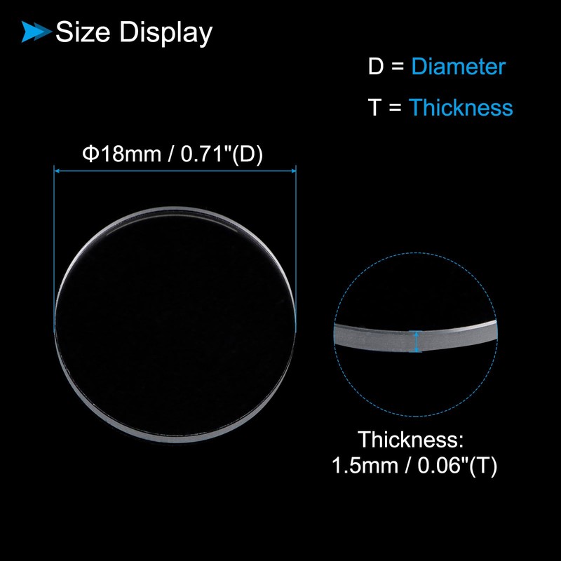 - Watch glass size: measured with a diameter of 18 mm (0.71 inches) and a thickness of 1.5 mm (0.06 inches), these clear crystal lenses fit watches for an upgrade or repairs.