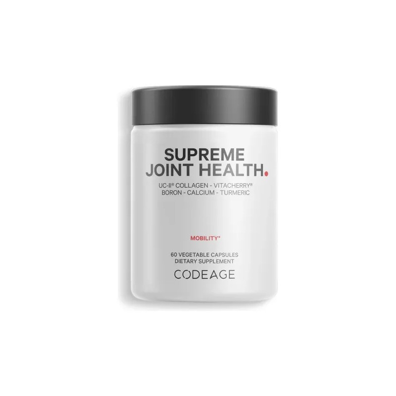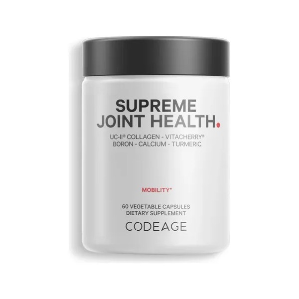 Codeage Supreme Joint Health es un suplemento de fórmula compleja que contiene colágeno UC-II® y cereza ácida entera VitaCherry® Sport. Esta mezcla sinérgica ofrece 10 mg de colágeno tipo 2 no desnaturalizado y 300 mg de extracto de cereza ácida entera VitaCherry® Sport por porción.