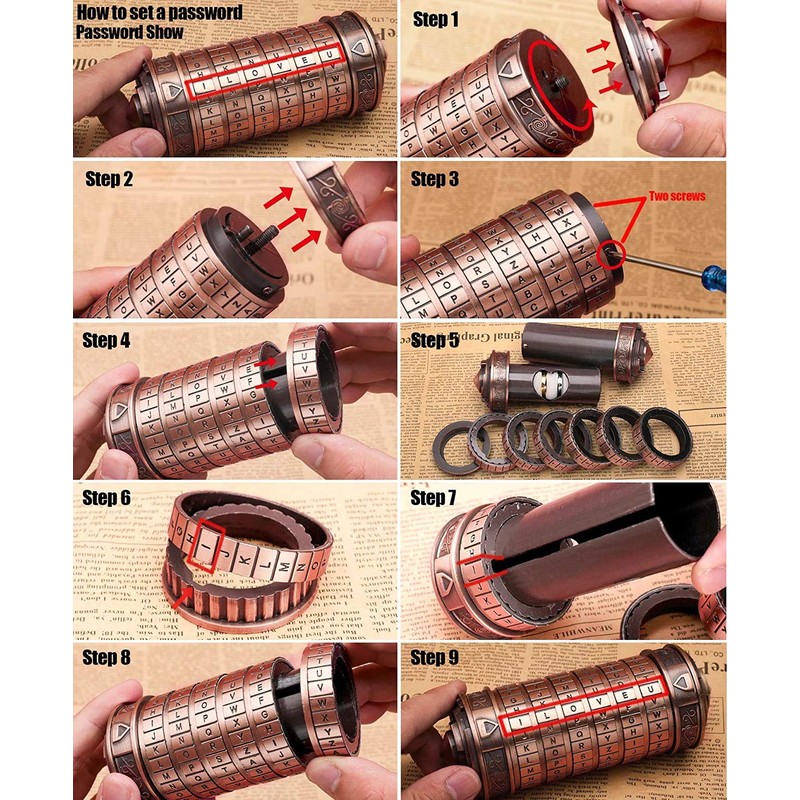- EASY TO USEPassword setting: The default password of the cryptex is I LOVE U, you can also set your own password. We provide steps and tools to modify the password, which is very simple. You can play a detective game with your partner or children and provide different clues for the other party to analyze the password and get clues. This kind of puzzle game not only trains thinking ability, but also promotes your feelings.