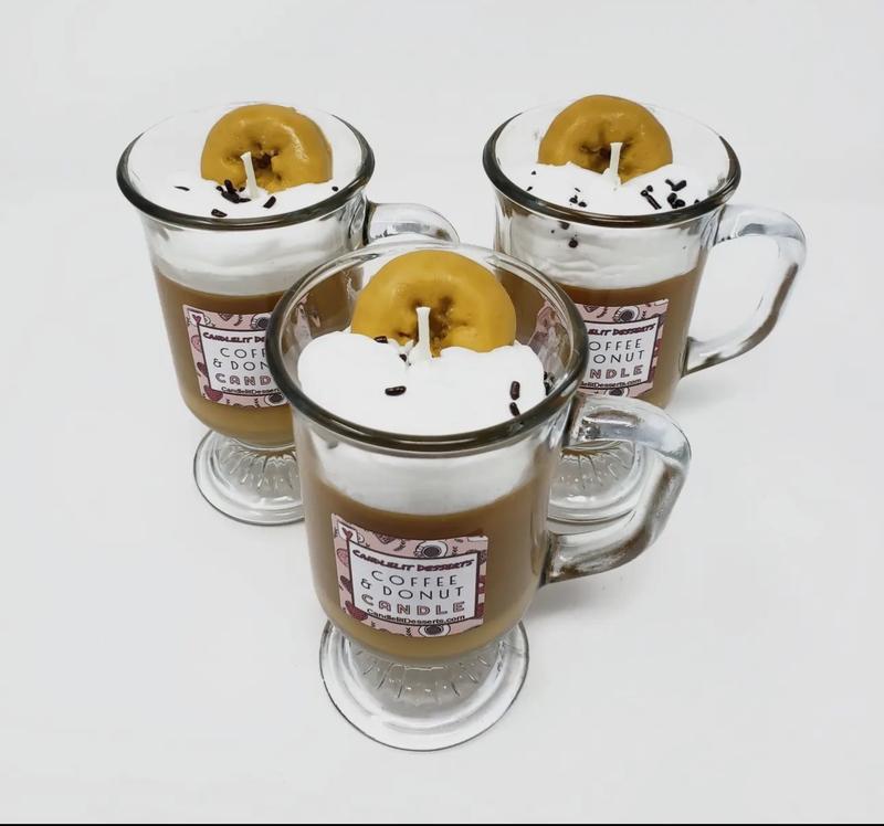 10 oz Coffee & Donut scented candle Topped with a wax donut & Sprinkles