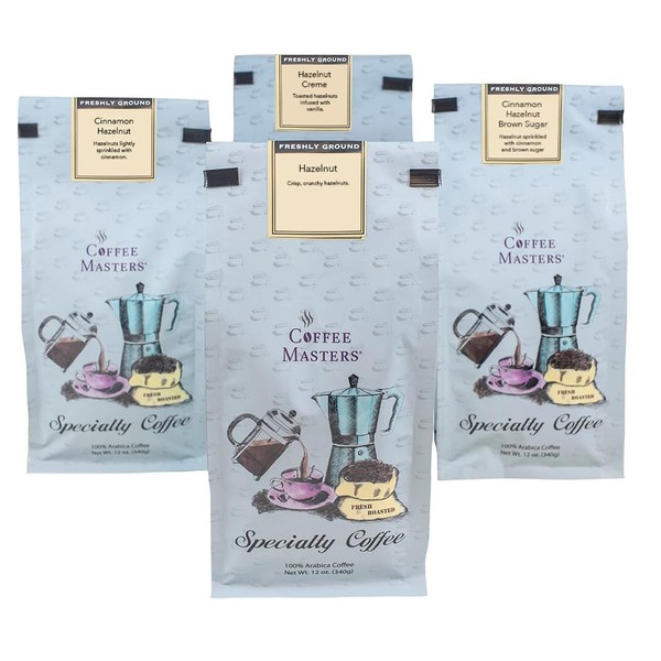 Coffee Masters Ground Coffee Sampler, Hazelnut, Cinnamon Hazelnut, Hazelnut Creme and Cinnamon Hazelnut Brown Sugar, 48 Ounce