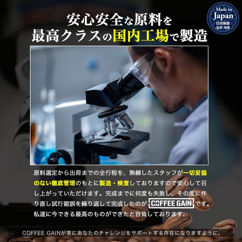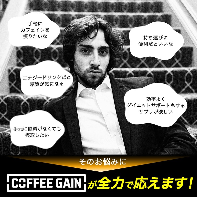 - 【COFFEEGAINとは?】 コーヒー本来の効能をイメージする「集中」&「燃焼」に着目。 さらに「脳活」をジョインさせた、次世代のエナジーブレイン・サプリメントです。 COFFEEGAINは、噛み砕いて摂取していただくサプリメントです。 エナジードリンクのように冷えていなくても、サプリメントのように手元に飲料がなくても、噛み砕くなどして美味しく召し上がっていただくことが可能です。
