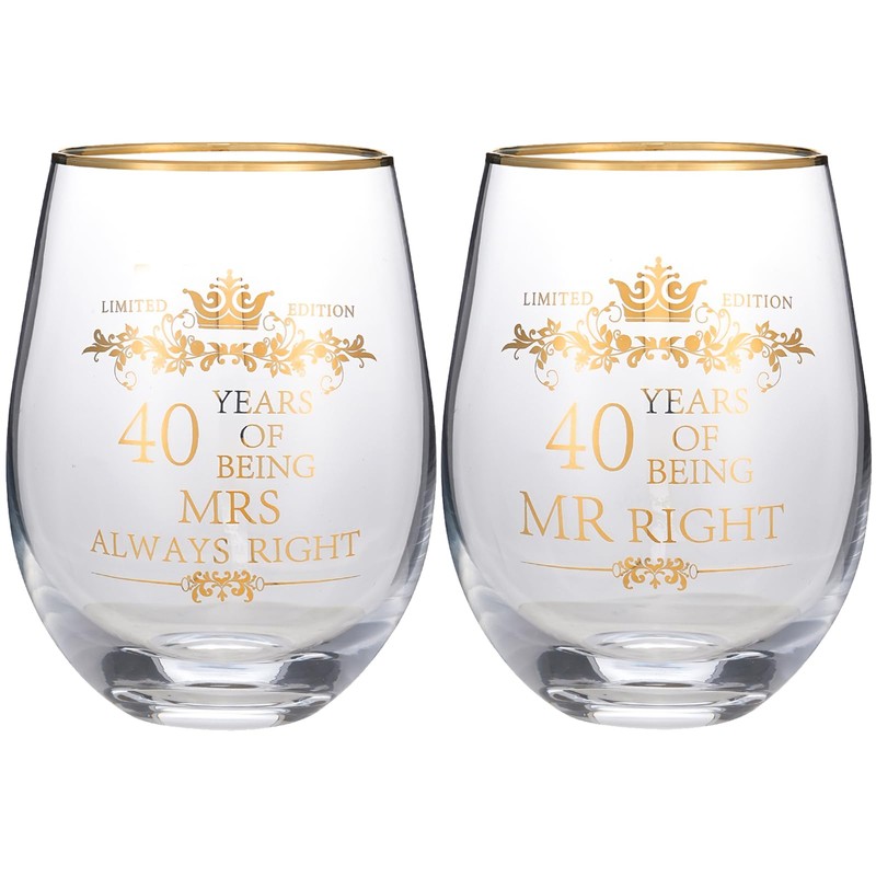 COFOZA Set of 2 40th Wedding Anniversary 15 Ounces Wine Glasses Tumblers Mr Right Mrs Always Right 40 Years Anniversary Cups Present for Couples Parents Gifts