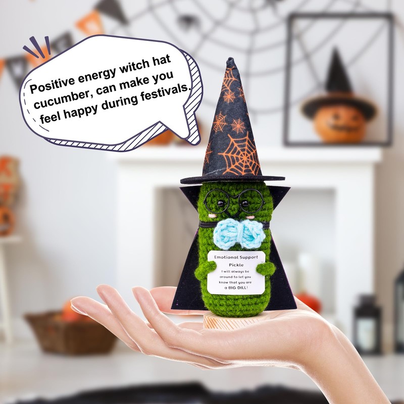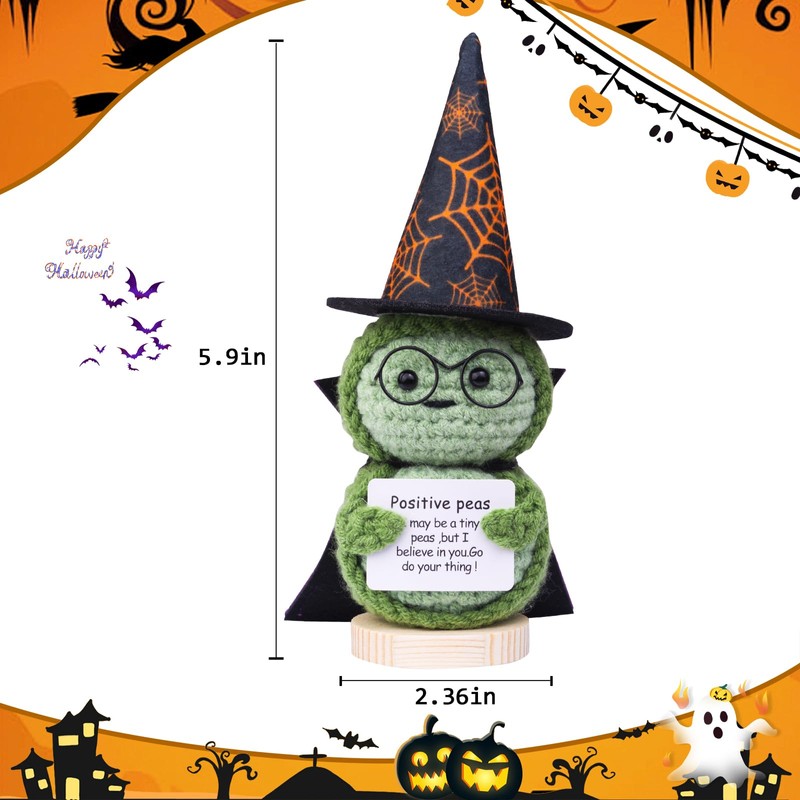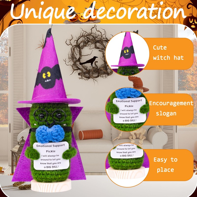 - 👻 Halloween-themed decoration: This front knitted cucumber, peas comes with a Halloween themed witch hat and cloak and glasses. It is perfect for decorating your car, home, office, desk, and other places, and adds fun elements to Halloween themed party decorations. Illuminate your area with this cute decoration!