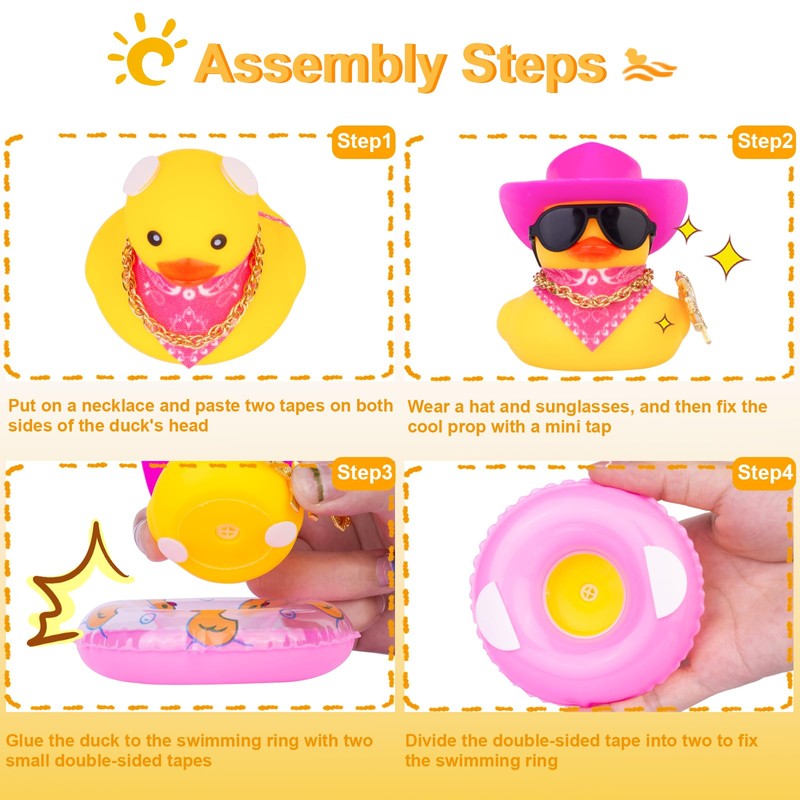 - Pato de bricolaje: puedes peinar pato de acuerdo a tus preferencias. Alternativamente, puedes instalarlo de acuerdo con los siguientes pasos: usa un collar y anteojos de sol, ata una bufanda, fija el sombrero con mini cinta, pega el accesorio especial al lado del pato, pega el pato en el anillo de natación y luego fija el anillo de natación donde quieras ponerlo.