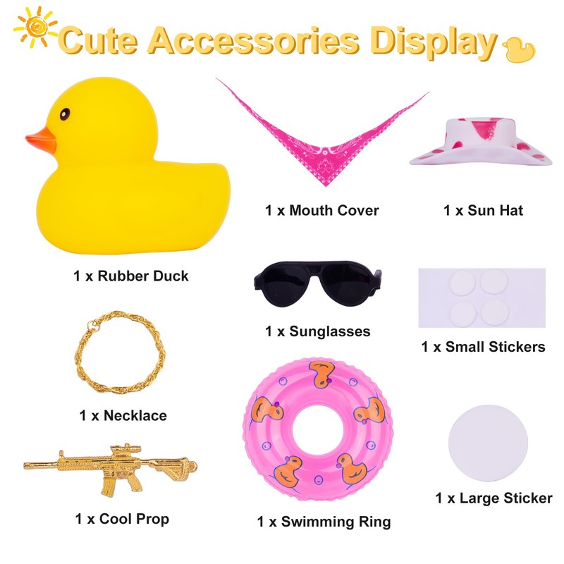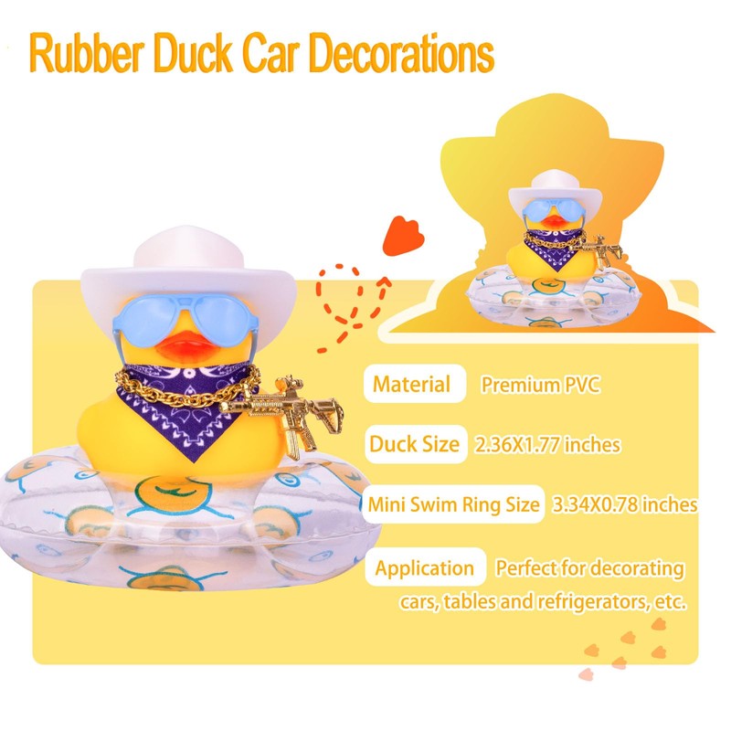 - Diseño novedoso: la decoración del tablero de goma de pato está equipada con un accesorio fresco en el lateral del pato, un sombrero de sol/sombrero de vaquero, bufanda, collar, rosquilla de natación y anteojos de sol. Es un pato de goma novedoso y lindo para decorar tu coche.