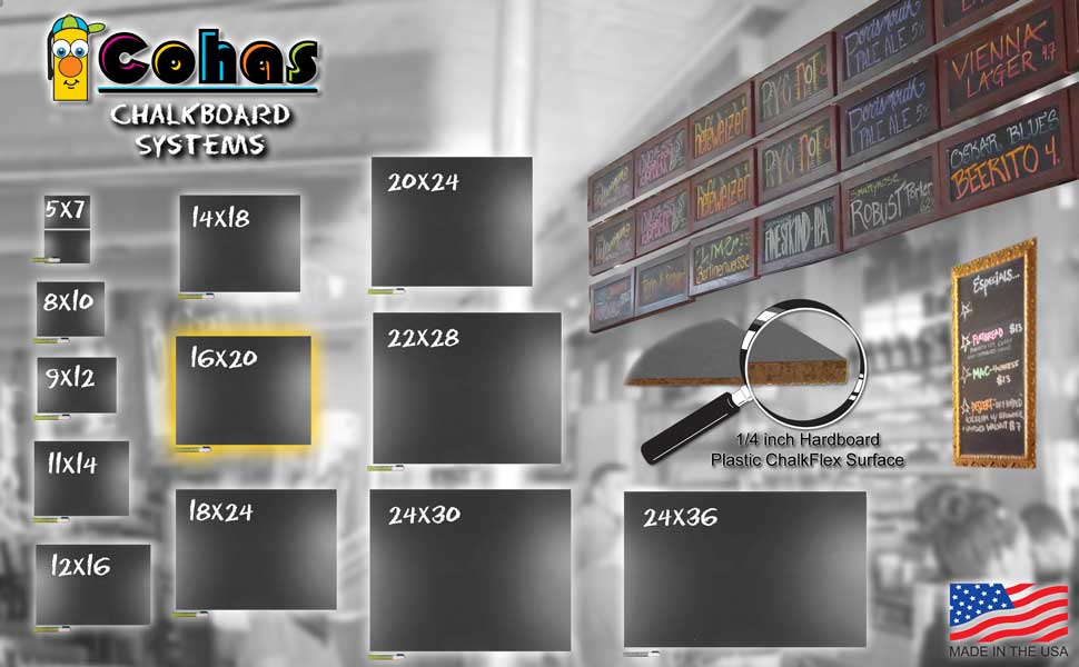 - Each board measures 16 by 20 by 1/4 inches. Blackboard surface is mounted to a quality hardboard backing made from recycled material. Do not submerge or use in damp or outdoor settings. Product is manufactured, packaged, and shipped in the USA.