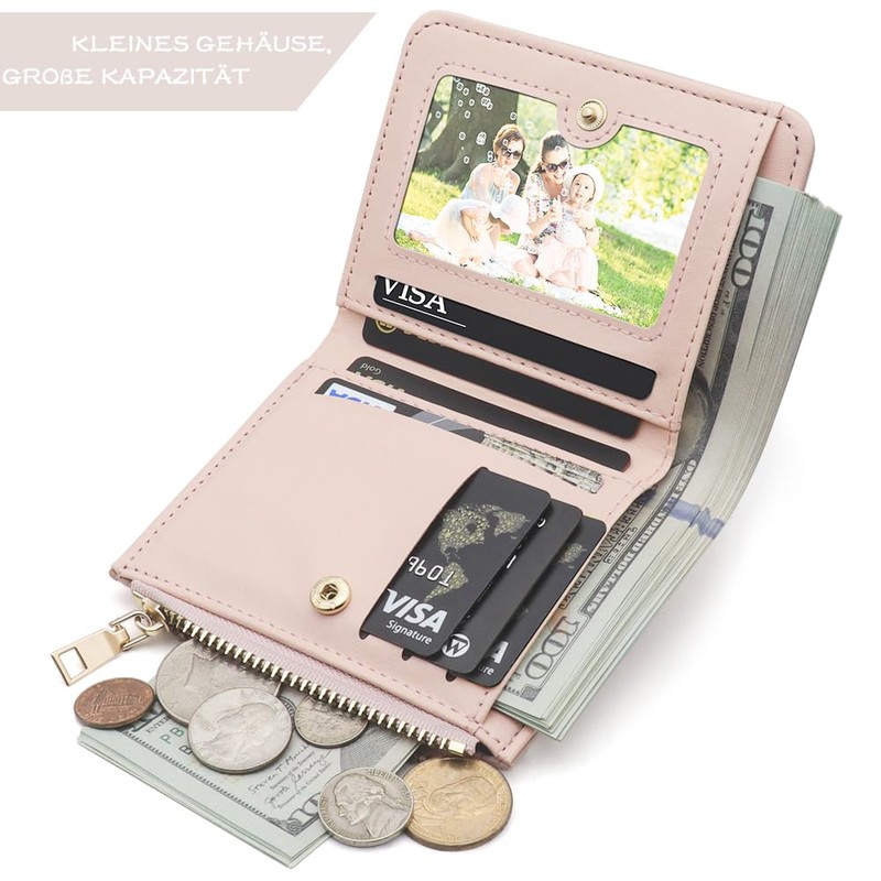 - Large capacity: this small women's wallet has a large interior. There are 6 credit card slots, 1 transparent window, 1 note compartment and 1 coin compartment with press stud for change. Snap pockets provide space for change, coins, rings, picture and keys, etc.