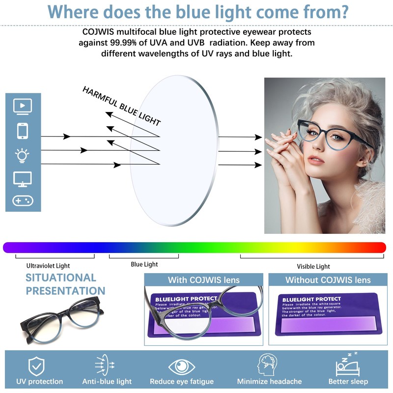 • ANTI-BLUE LIGHT PROGRESSIVE MULTIFOCAL LENSES - See far and near without changing glasses, filters out high-energy (HEV) blue light from digital devices and other light sources to reduce eye fatigue