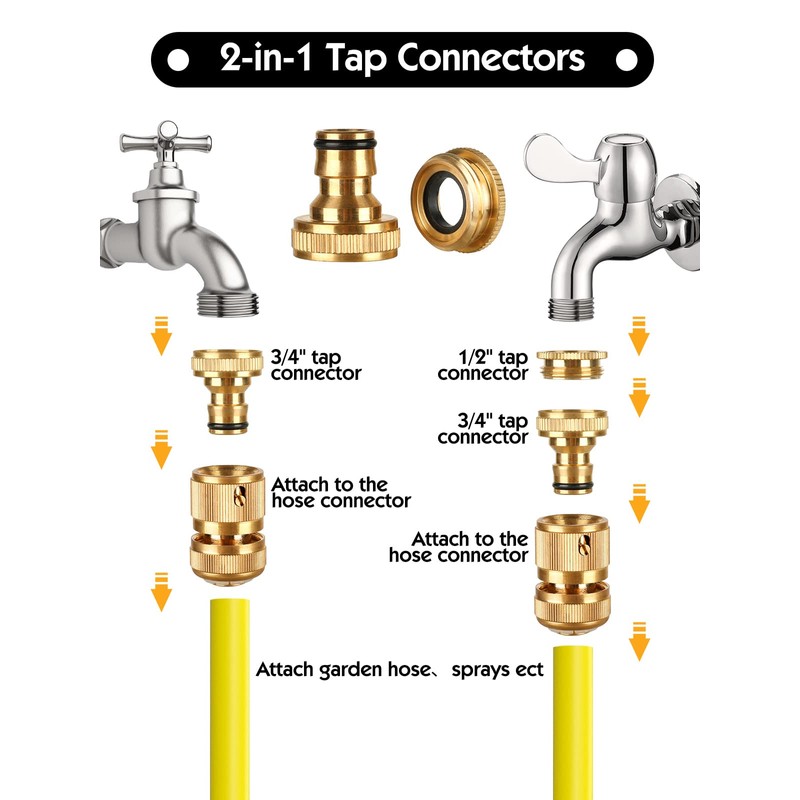 - 2-in-1 tap adapter: the tap adapter can fit 1/2 inch or 3/4 inch tap, when both parts are combined, the connection fits a 1/2 inch tap, and when you unscrew the lower part, the adapter fits 3/4 inch tap, which can be securely attached to the tap.