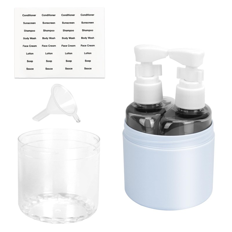 - Practical Travel Bottles Set: You will get a 2 in 1 Travel bottle kit includes 2 * 100 ml lotion bottles, 1 stickable waterproof label (32pcs), 1 funnel and 1 portable packaging box with twistable lid for better leakage prevention. Perfect for shampoo, conditioner, body wash, lotion, toner and more.