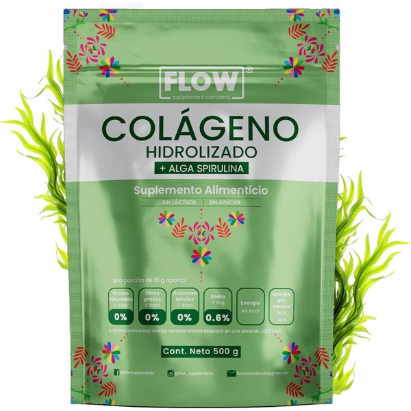 Colágeno Hidrolizado con Espirulina - 500g en Polvo - Colágeno con Magnesio, Vitamina C y Biotina - Suplemento Alimenticio Sin Azúcar ni Aditivos - Flow Supplements