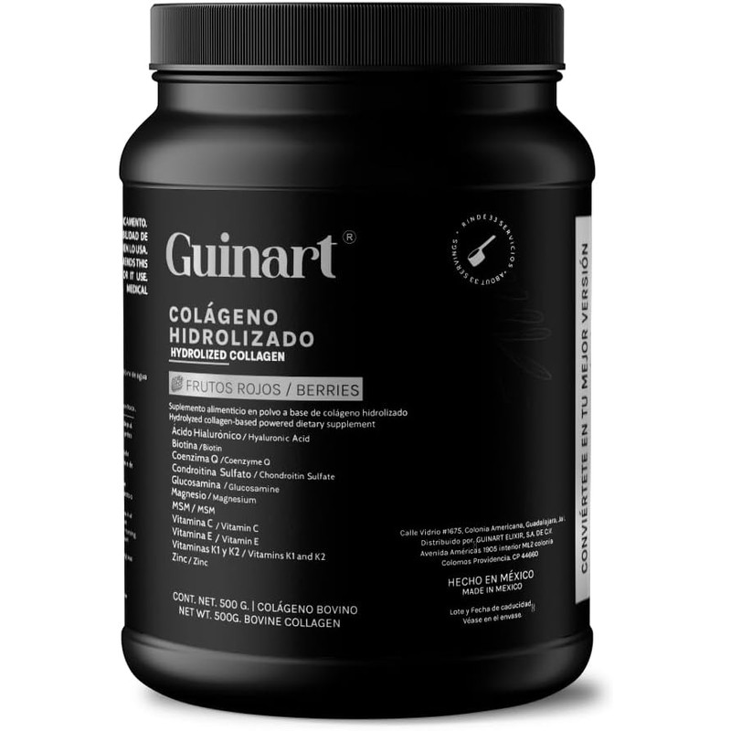 GUINART Colágeno Hidrolizado en Polvo está formulado para apoyar el bienestar integral de tu cuerpo, combinando los beneficios del colágeno bovino con ácido hialurónico, glucosamina, chondroitina, MSM, Coenzima Q10, y vitaminas esenciales como C, E, K1 y K2.